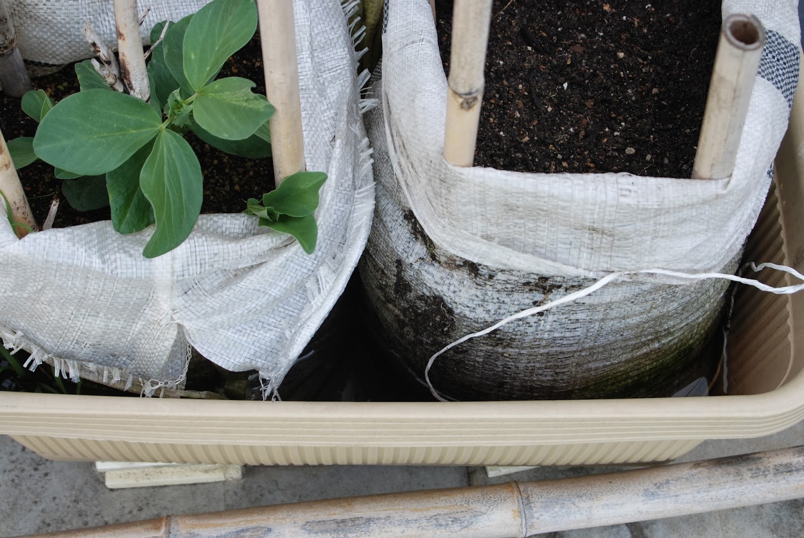 こちらは、屋上土嚢袋で腰水法をおこなっている空豆。
