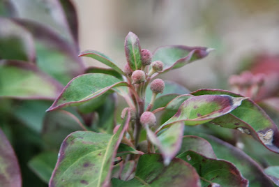 | 現在のヤマボウシの実。この実は小さな青いものは9月頃からあった。 最近赤みを帯びてきたといっても、大きさは昨年収穫した赤い実の1/10くらいだ。 ここに付いている実は来年大きくなるのだろうか? |