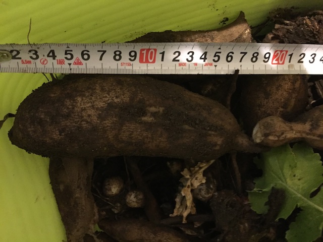 ただ、今期は20cmをしっかり超えるようなヤーコンが1個も収穫出来なかったので、残しておいた最後の一株では今年の大きさ記録に期待した。