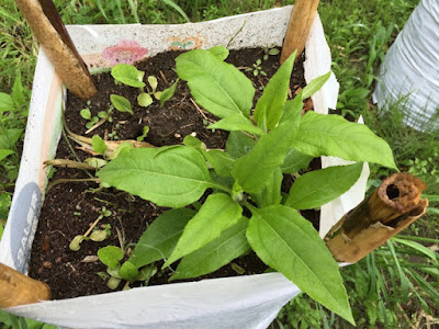 | 土を袋の中に入れる時、小さなキクイモか、その切れ端が残っていたのだ。 端の方に、ゴボウの小さな苗が見えているが、今後が危うい。 当然キクイモは引き抜くのがが、狭い袋の中では芋は取りきれないことが多い。 |