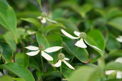 秋には赤くなる実が今は花びらの中心に鎮座している。