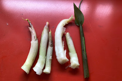 | こちらは去年収穫したミョウガタケモドキ? 色彩的には根元から、白と緑と茶色の順で構成されていた。 |