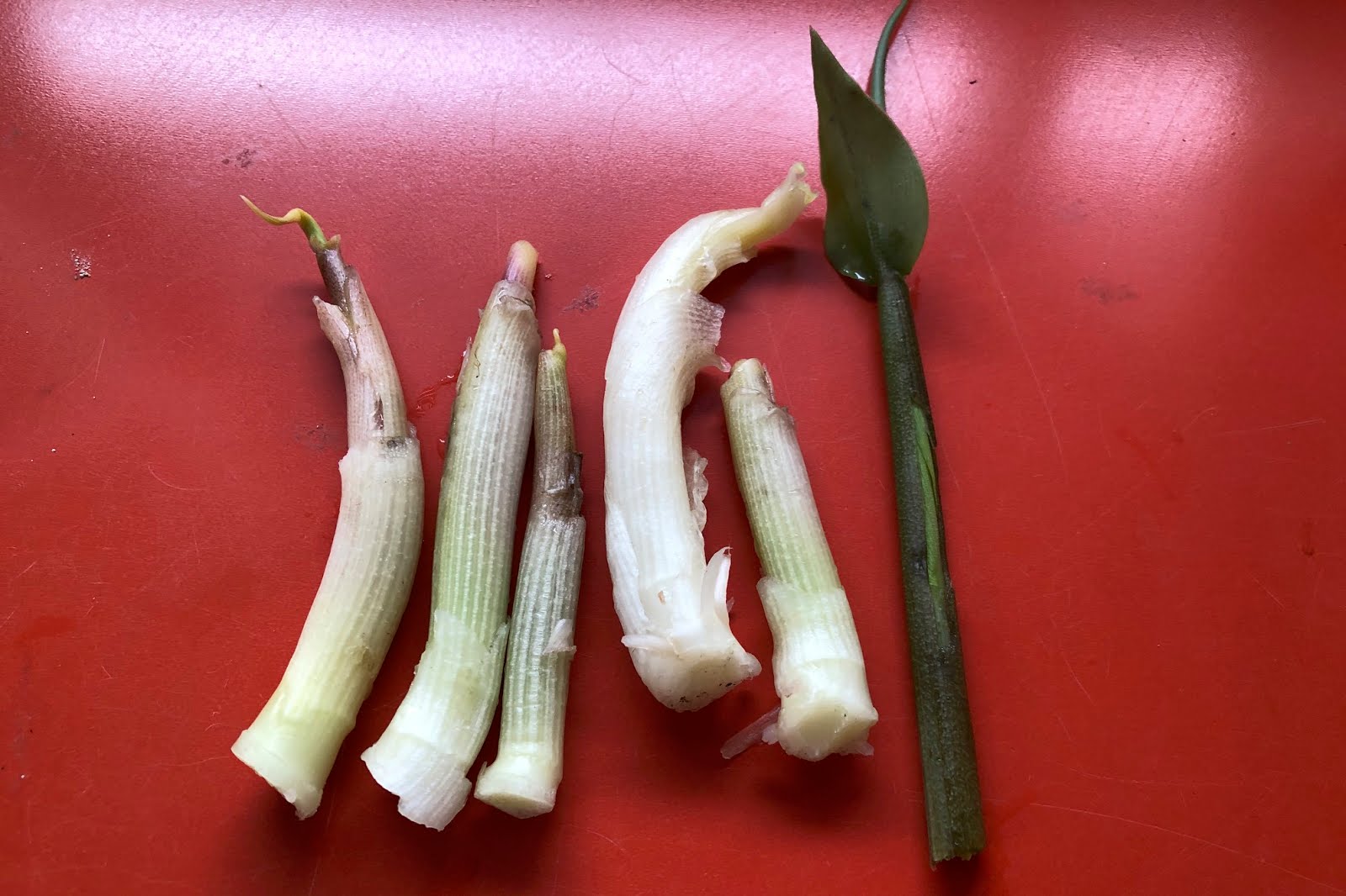 | 左5本がミョウガタケを育てようとして出来た茎芽。 確かにこちらもミョウガタケとは呼びにくい。 |