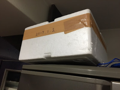 | 冷蔵庫の上では、つくね芋や里芋、そして種ショウガを保存していた。 今年は大小2個の発泡スチロールの箱に保存していた。 |