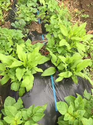 マルチの下から出てきたキクイモの芽は、植えた芋より数が多かった。