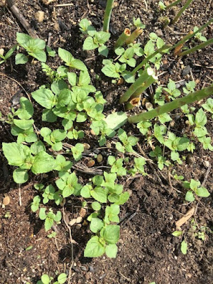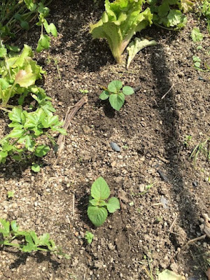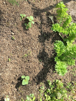 | こちらは、アスパラの畝に自然発生している青シソの芽。 |
