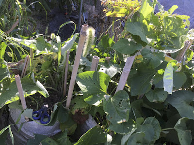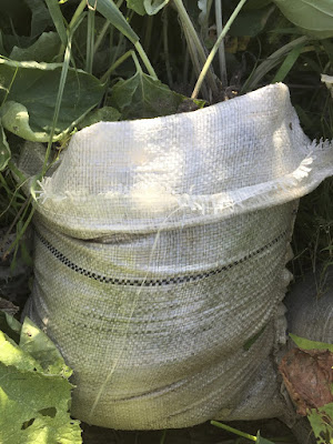 | 左の土嚢袋には短型ゴボウ。右のビニール袋では通常の長いゴボウを育てている。 真ん中の土嚢袋からは、四方にサツマイモの蔓葉が伸びている。 |