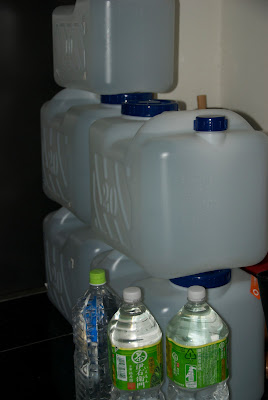 | さっそく我が家には水タンクが整列している。今日の年越しソバはさっそくこの水が活躍だ。 |