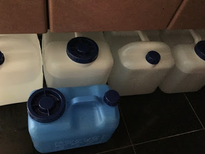 | 汲んだ炭酸水は主に10Lや20Lのポリタンクに保存している。 通常の水より炭酸水の方が長期保存ができるとのことだ。 |