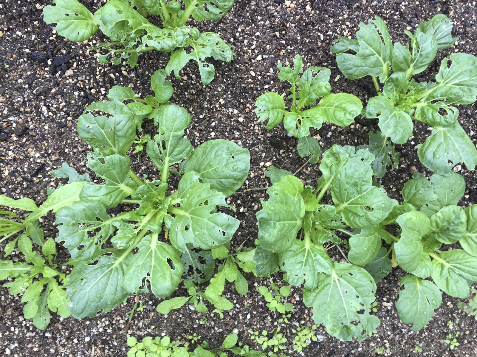 第1陣のターツァイの収穫が終わった頃、続けて収穫できると思って育てている第2陣は、防虫ネットをかけてないためか虫被害が大きい。