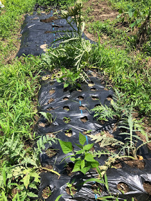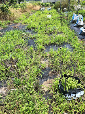 | ここがL字の一角、私が区画Aと呼んでいる場所。 防草シートの上の雑草を片付けるのは他の場所より面倒だ。 一面アーティチョークの花が空き乱れるのを夢見ていたのだが。。 |