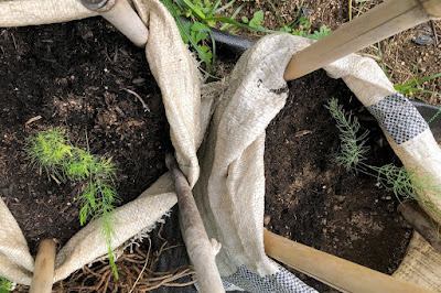 | 全部で6個ほどの土嚢袋に小さな苗を移植した。 |