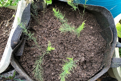 そこで、そんな土嚢袋や昨年移植してうまく育たなかった畝に、4月の初めに種を蒔いてそれなりに育ってきたアスパラの苗を移植することにした。