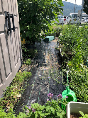 | ここは水やりがしっかりできるので、真夏の水不足で枯らすこともないと思われる。 もしかしたら、畝や土嚢袋よりここが一番大きく成長するかもしれない。 |