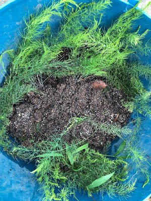 かろうじて、生き残っていたアスパラの苗は土嚢袋に移植して、雑草予防シートの上に置いていたのだが、残念ながらここでも全滅。