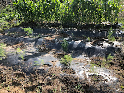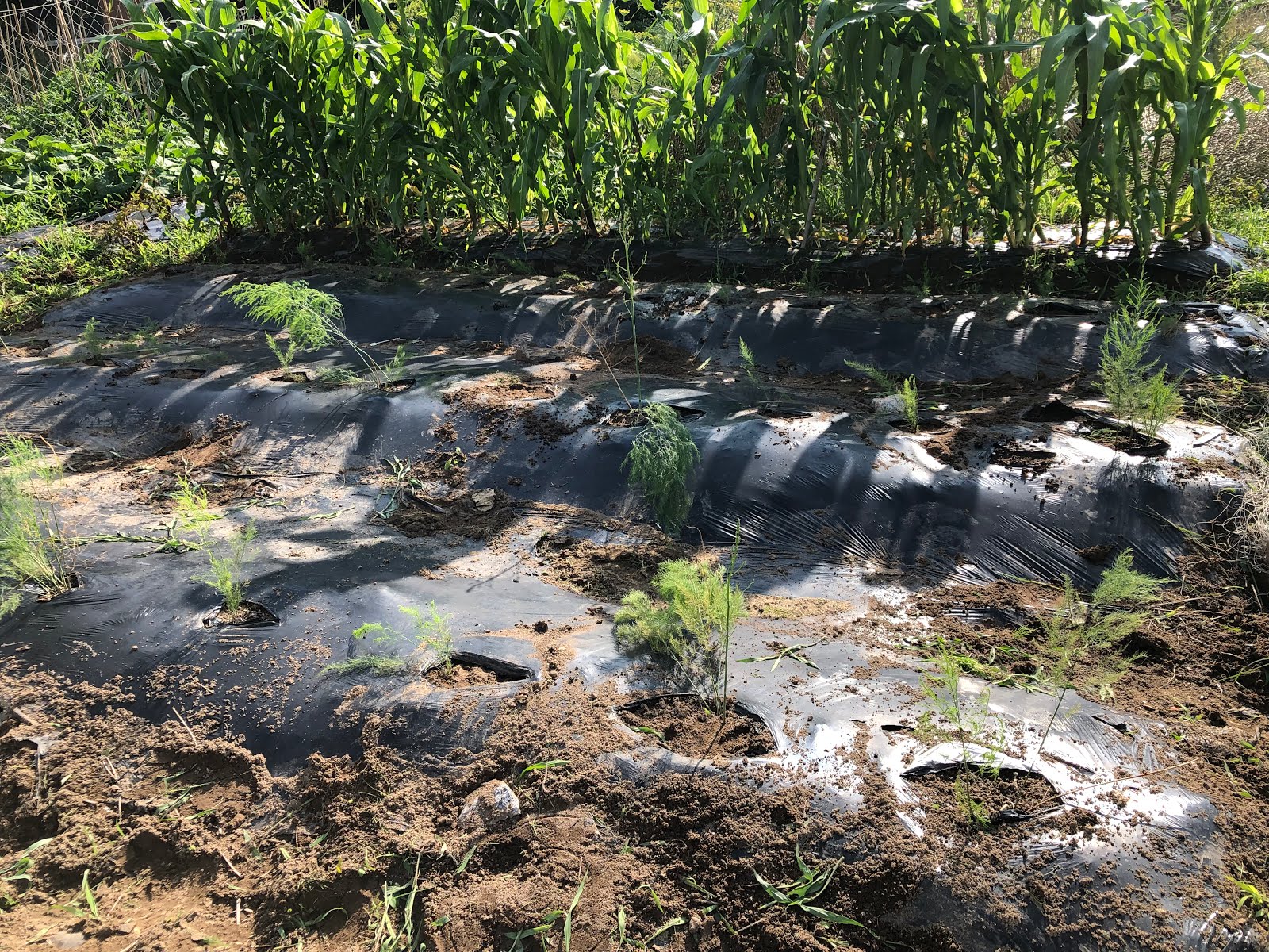 | こちらが雑草を抜き終わり、アスパラの苗の移植が終わった3列の畝。 奥の方には、トウモロコシの畝がある。 |