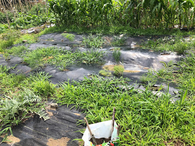 昨年移植してうまく育たなかった畝には雑草予防のマルチを敷いていたのだが、隙がある場所は写真のように雑草だらけ。