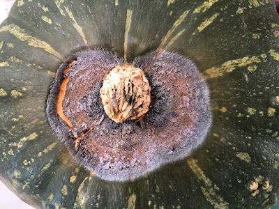 | こちらは、種取り用に残していた今年最大のえびすかぼちゃ。 見ての通り、ヘタの部分が腐れ始めている。 |
