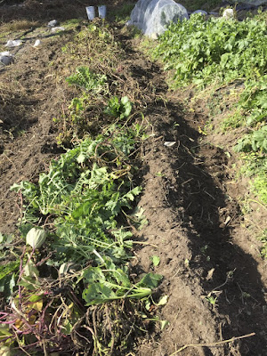 | 今年育てたカボチャの畝は、今は大根がいっぱい。 その左に見える荒地を来年のカボチャ用の畝にすることにした。 |