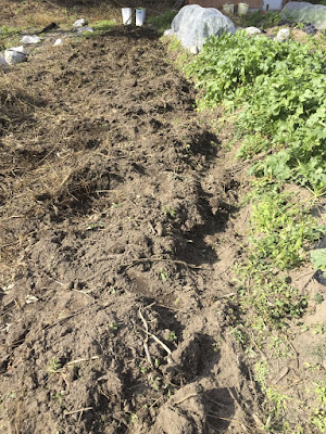 枝切りハサミで、溝に入れ込んだた蔓葉などを細かくして、そこに自家製のEM1や米ぬか、魚粉などで作ったボカシ肥料を撒いていった。