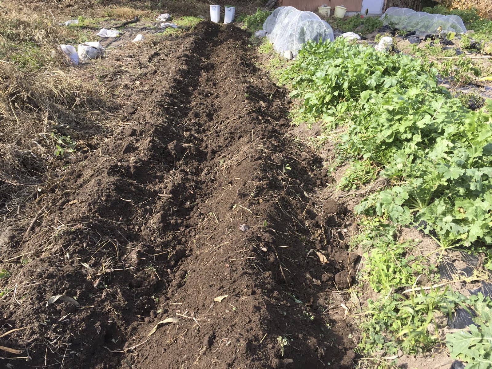その溝に、緑肥とは言えないかもしれないが、落花生や、大量のサツマイモの収穫後の蔓葉を置いていった。
