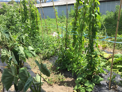 こちらは、特に発育が悪い第2菜園のツクネ芋の畝。 ヒョロヒョロ伸びた弱々しい苗。 ここで、台風で支柱ごと倒れたらさらに苗が弱ってしまう。 |