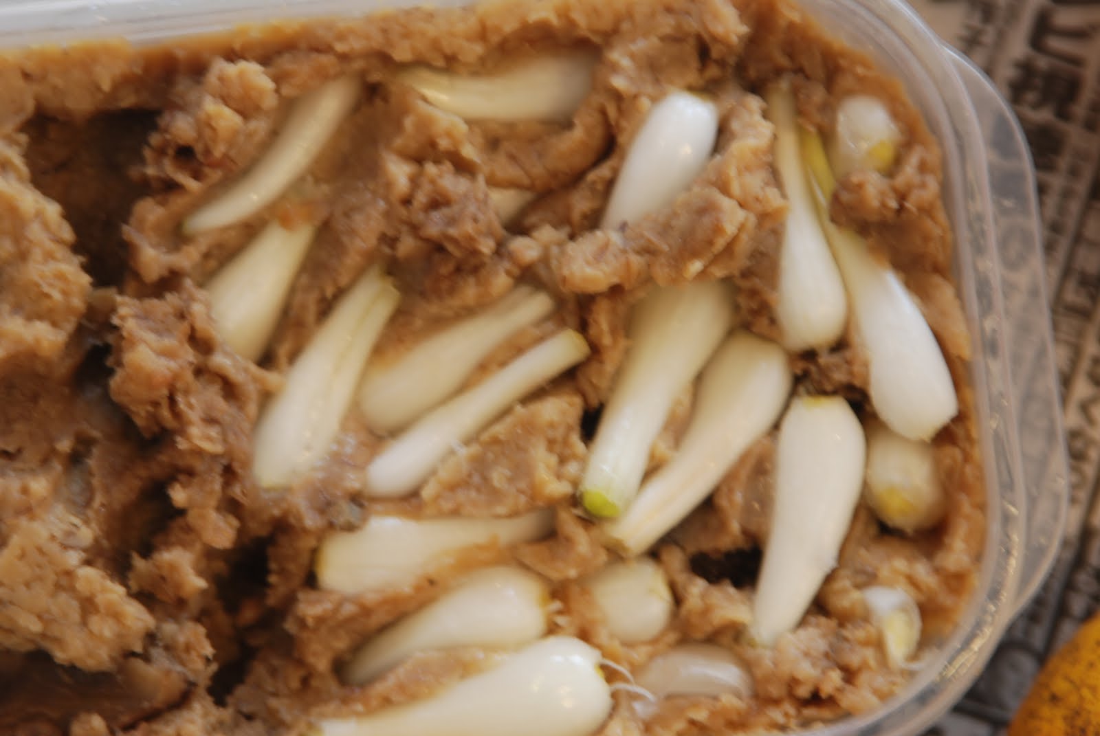 収穫したラッキョウはこんな感じで味噌に漬け、今日食べてみた。