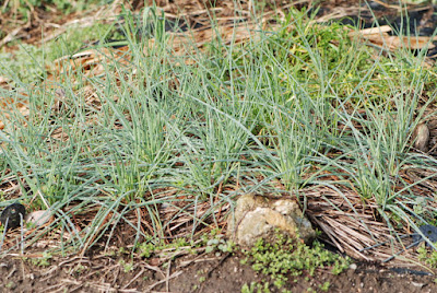| ご近所さんに、冬の時期は藁を敷き詰めるといいと聞いてそのようにしている。 確かに今年のラッキョウは、これまでで一番元気なように見える。 |