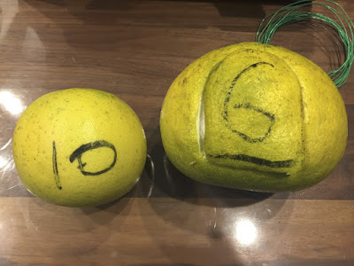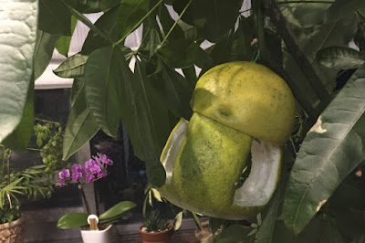 今取り置きの晩白柚は収穫した時は青かったのだが、今では食べごろの色になっている。