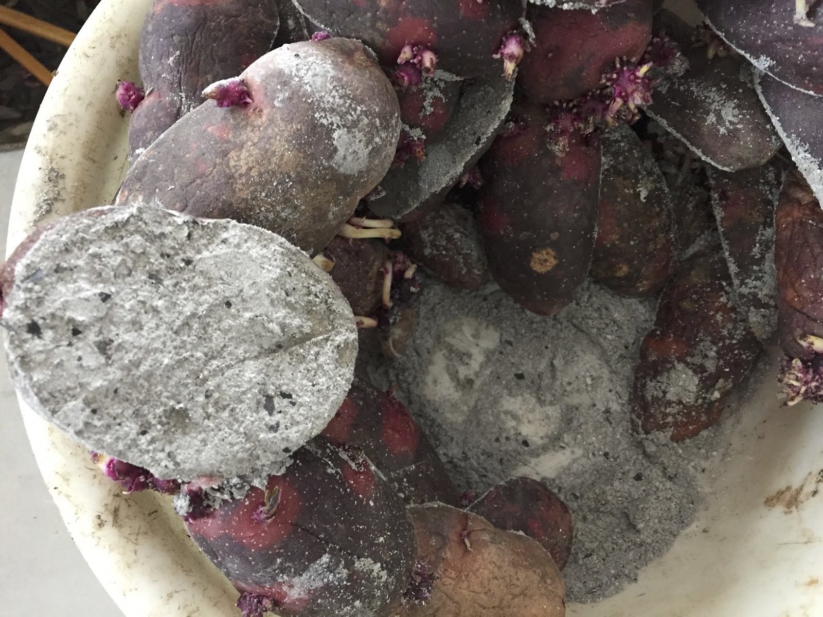 今日はそんな種芋を半切して木灰をまぶしておいた。