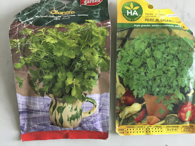 | 左がコリアンダー、右がイタリアンパセリの種袋。 どちらの種も、少し古くなってきたので、芽出しがうまくいくか少し不安だ。 |