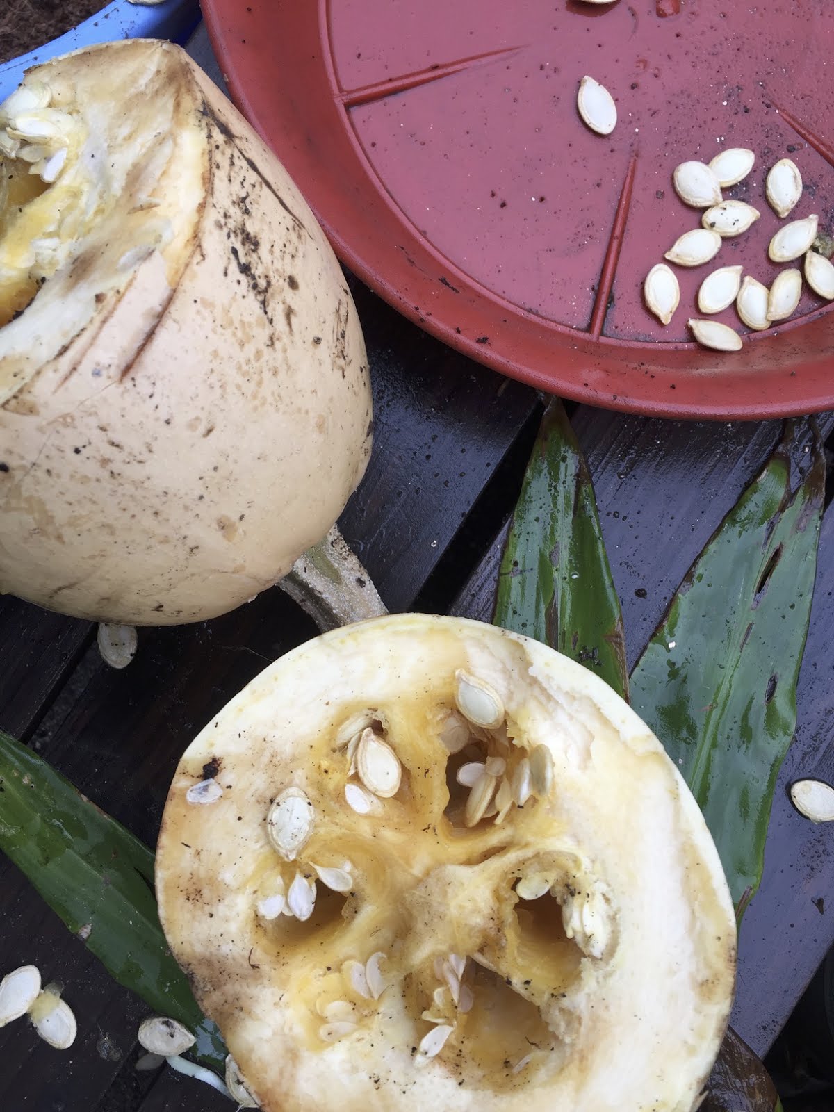| 今日はここに置いている白ズッキーニから、種取りをした。 これらは、先日畑を片付けた時に取っておいた、収穫忘れの白ズッキーニだ。 |
