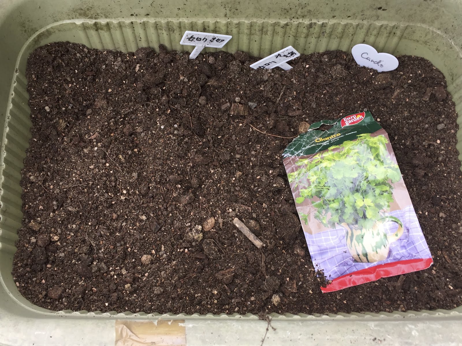 | このプランターでは春はセロリを種蒔きして失敗。初夏にはCardoの種をまいて失敗した。 今回のコリアンダーはうまく育ってくれると思っているが、果たしてどうだろう? |