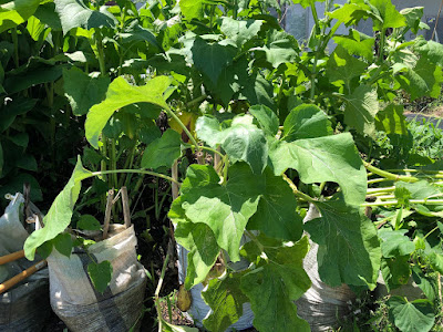 | ここは第1菜園のヤーコンだが手前にビニール袋栽培のゴボウの苗がある。 ゴボウが後方のヤーコンの陰になってかわいそう。 5個あるビニール袋のゴボウで、1か月前までは1番手だったが今は3番手だ。 |