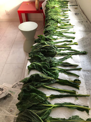 | 本当は梅雨明けにやるとすぐカラカラに乾くのだが。。 ま、4~5日も干せばヤーコン葉茶の出来上がりだ。 |