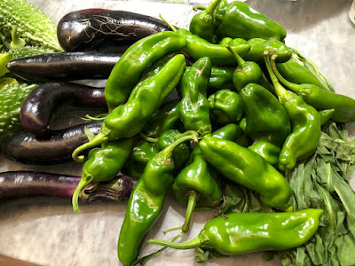 | ピーマンはまだまだキレイでサラダにも入れている。こちらが西の横綱だ。 ししとうと交雑したのだろうか、ピリリと辛いものも混ざっている。 今日はリーフチコリーとナスも収穫して帰った。 |
