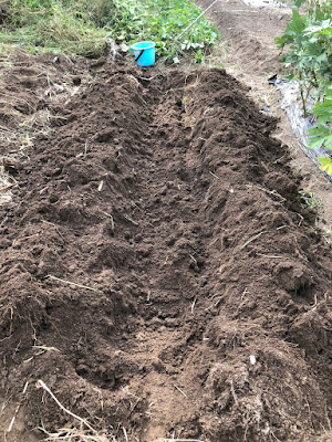 雑草を片付けたら、予定の畝に溝を掘り、最近の畝で行っている雑草植え込みを行った。