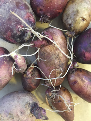 | この時期の収穫では、毎年こんな芋がたくさん出る。 芽や根が出ている芋は他の芋より味は落ちるような気がしている。 ただ、実際味の違いを確かめている訳ではないので真実は分からない。 |