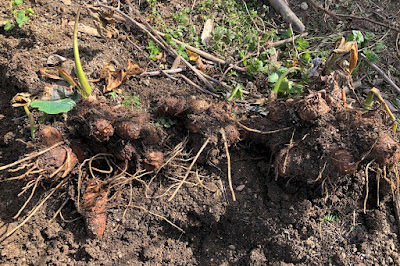 | 次回最終収穫になる3株。 3月に植える種芋として少しでも大きな親芋が採れると嬉しいのだが。 |