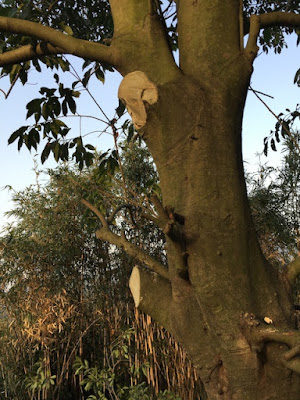 こちらは、「ついに切られたか」と苦笑いしているように見える玉切りした木。