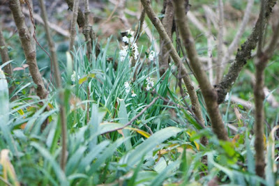 | 著莪に負けず毎年楽しませてほしい水仙。 手前の大きな葉は著莪の葉。間に林立している幹はダラの木。 |