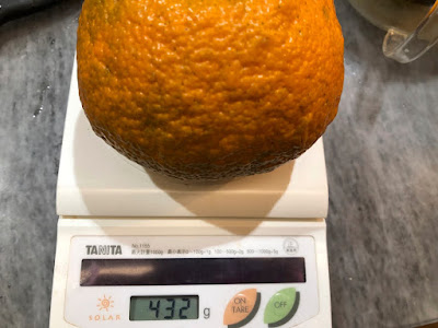 | 432gで記録更新とはならなかった。 先日の446gの伊予柑も11cm以上あったのは間違いないだろう。 |