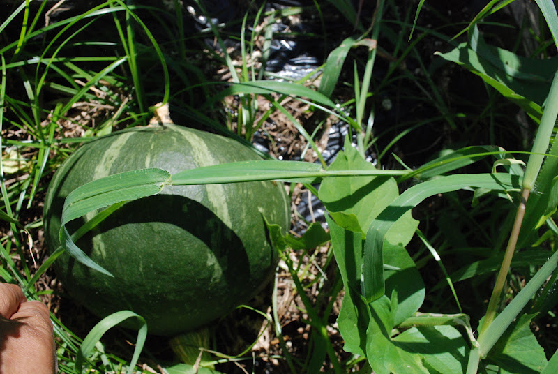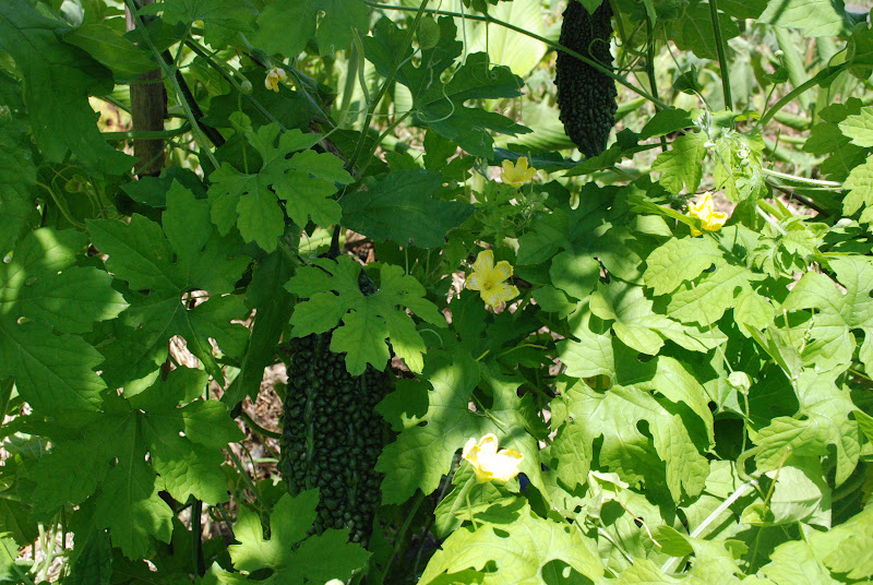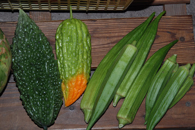 | 屋上菜園のサラダゴーヤは大きくなりかけ状態で早くも変色 この時期5日間放置するとオクラは大きくなりすぎたものがいっぱいあった。 |