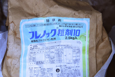| 実は2年程前に、笹竹の除草用ということで知人からこの薬剤を譲り受けていたのだ。 これまでは自分の力を信じてこの薬は棚に置いたままにしていた。今回初めての出動だ。 |