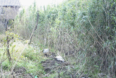 | こちらは今年2月、境界に溝を掘って、笹竹に勝った気分で土嚢袋やガラ袋を並べた所。 |