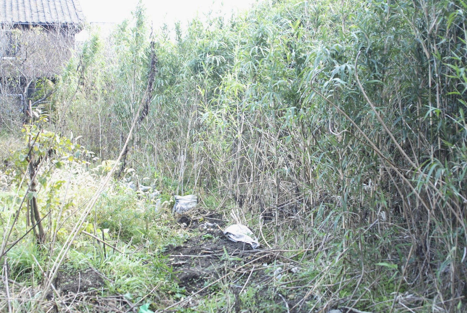 今年の2月、休閑地にはびこる笹竹との境界部に溝を掘って、笹竹に勝った気分になっていた。そして、その境界部に土嚢袋やガラ袋を置いた。