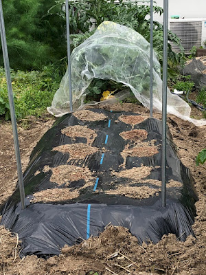 ここ数年25cmを超える芋が収穫できていないので、今年のこちらの畝では、久しぶりにマルチをかけないで育ててみようと思っている。