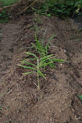 ここ数日カラカラだった畑に夕立が2日間降ってくれた。今日がチャンスだ。8本程ショウガの苗を移植した。