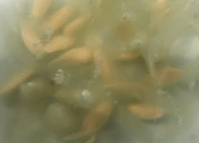 そんな種にはゼリー状のネバネバが様のくっついて、この中には発芽抑制物質が含まれているとのことなので、一晩水に浸けた。