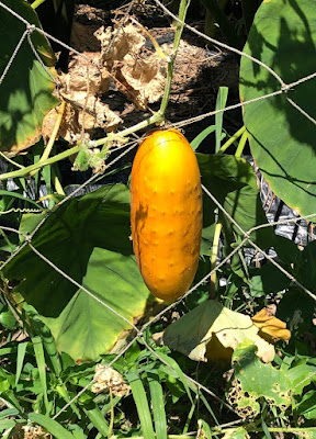 | 茎は枯れ始めていたので、こんな実をいくつか2週間前に種採り用に収穫。 短寸キュウリと言っても、中の2個は20㎝近い大きさまで巨大化していた。 |